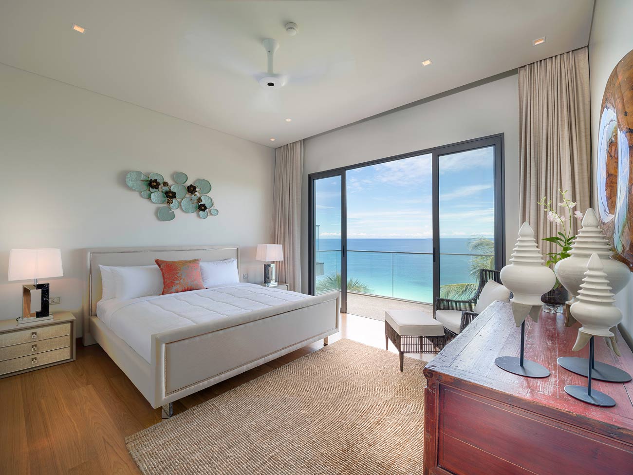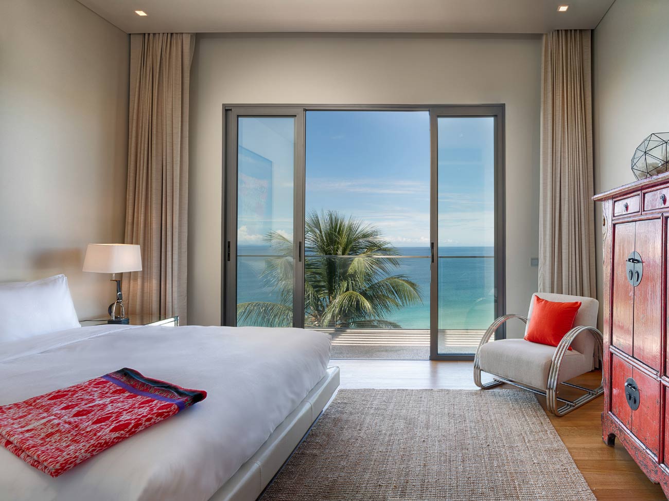 Master Bedroom 1 (Upper floor) — King-size bed; Sea view; Direct pool access; Lounge; Air-conditioning; Walk-in closet; Ensuite bathroom with double bathtub, shower and double vanities; Connected to Kids’ playroom