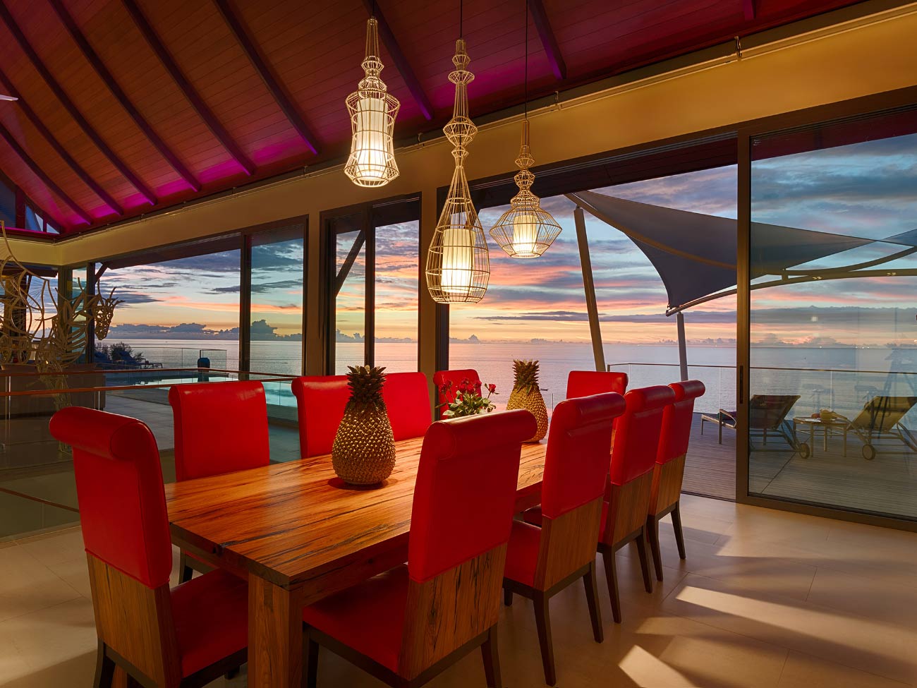 After a day of exploring the island or lounging by the pool, retire to the plush master bedroom suite for a peaceful night’s sleep. The grand bedroom is situated in a poolside pavilion and features a king-size bed, double soaker tub in the ensuite bathroom, and stunning views of the sea. The three king-bedded guest bedrooms are no less stylish, boasting sea-view balconies and private bathrooms.