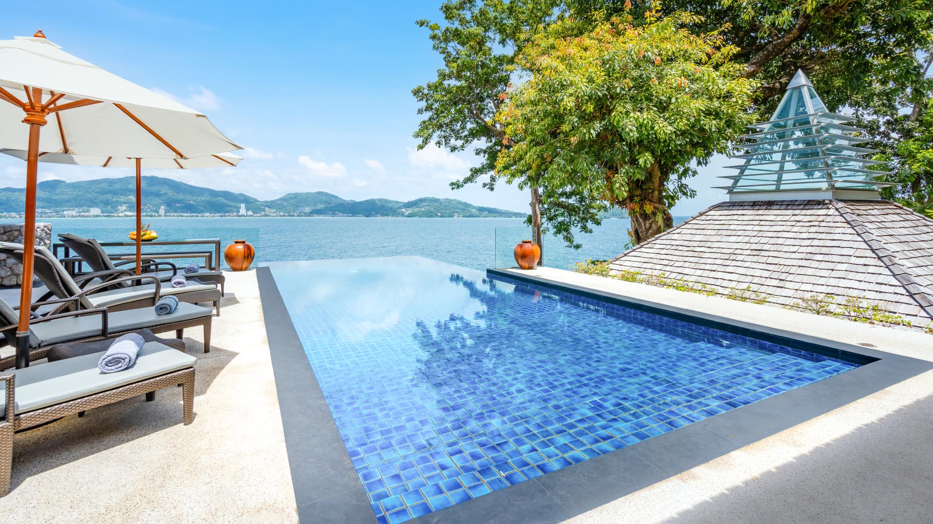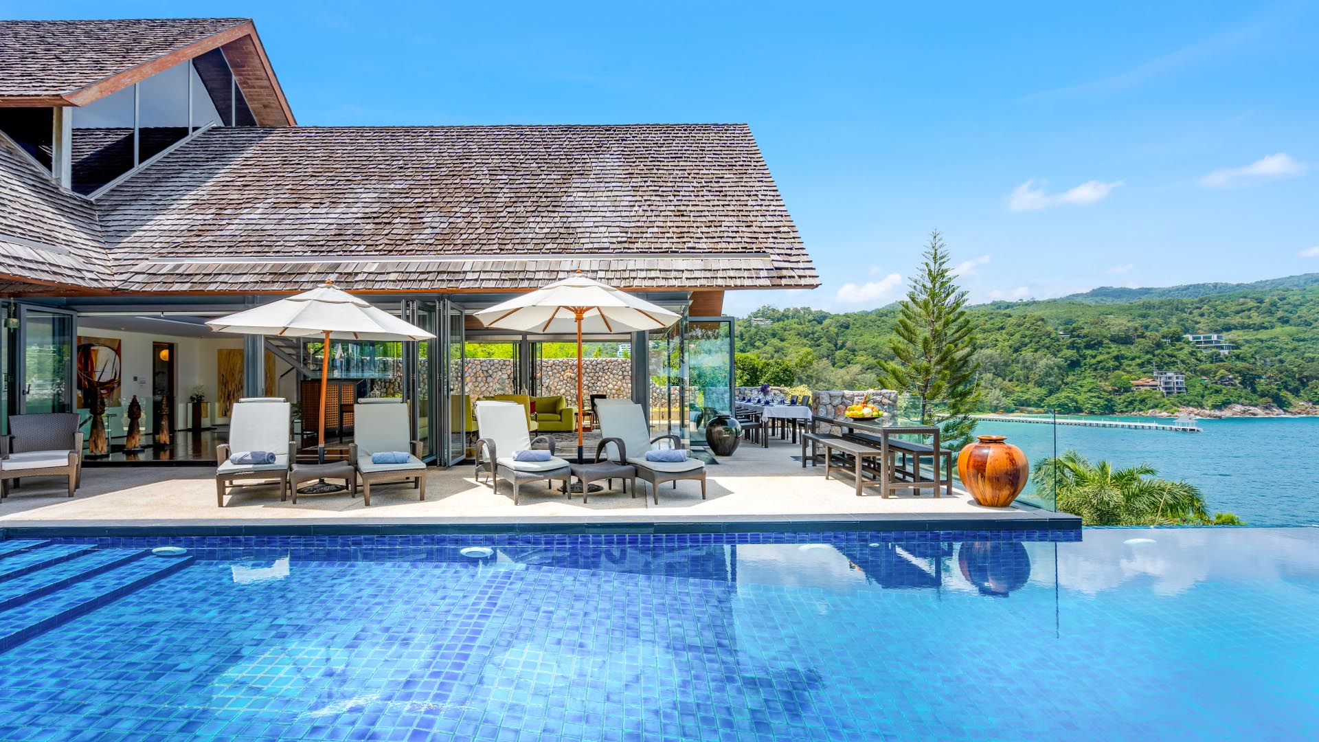 Situated 40 meters above sea level, Villa Rom Trai rests gracefully within the exclusive Samsara Estate overlooking Nakalay Bay in Phuket, Thailand. Thoughtfully designed that follow the natural hillside, this villa accommodates up to 10 guests and offers uninterrupted panoramic views of Patong Bay and the Andaman Sea from nearly every vantage point. Expansive floor-to-ceiling sliding doors open onto broad terraces, framing the serene beauty of the ocean and the lush coastal surroundings.