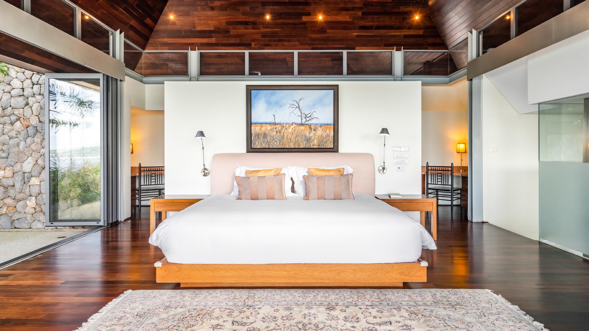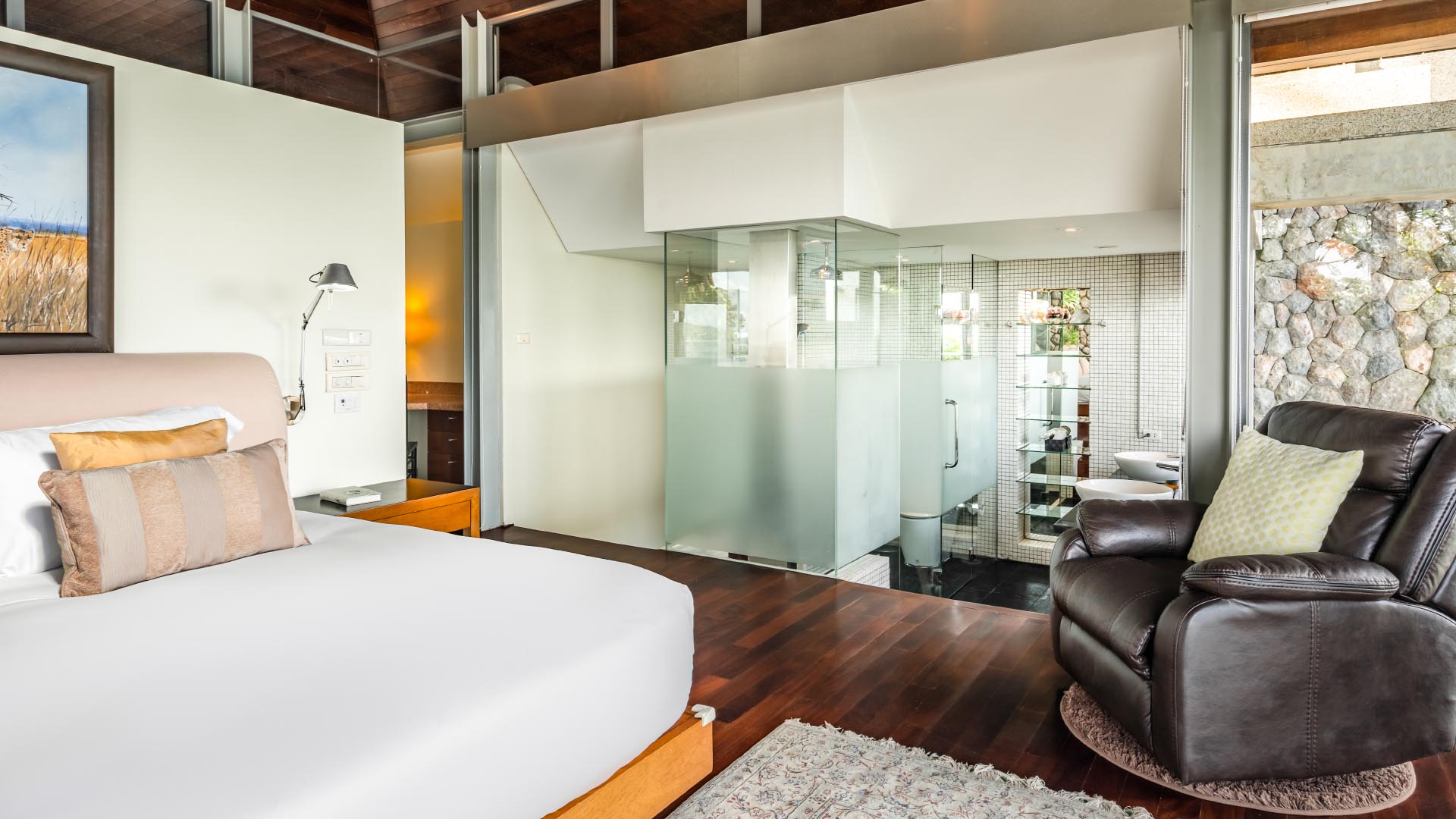Master Bedroom – King size bed; Ocean and garden views; Private terrace with lounge chairs; Walk-in closet; 48-inch LCD TV with DVD; Air conditioning; Ensuite Bathroom with two vanities, rain shower, toilet, Toiletries; Hair dryer; Bathrobes; Slippers; Umbrella; Outdoor whirlpool and tub