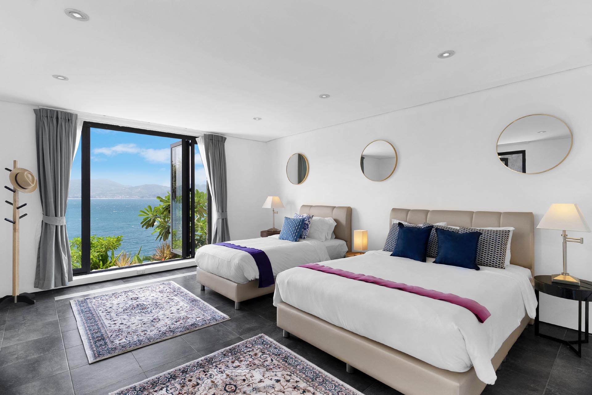 The villa features five elegant bedrooms, each with sweeping ocean views and king-size beds for luxurious comfort. The master suite stands out with its private terrace, complete with an outdoor whirlpool tub and ensuite bathroom, offering the ultimate space for relaxation. The second guest bedroom also enjoys a private terrace, ideal for quiet moments of seclusion. Bedrooms three and four share a terrace and bathroom, making them perfect for families with children.