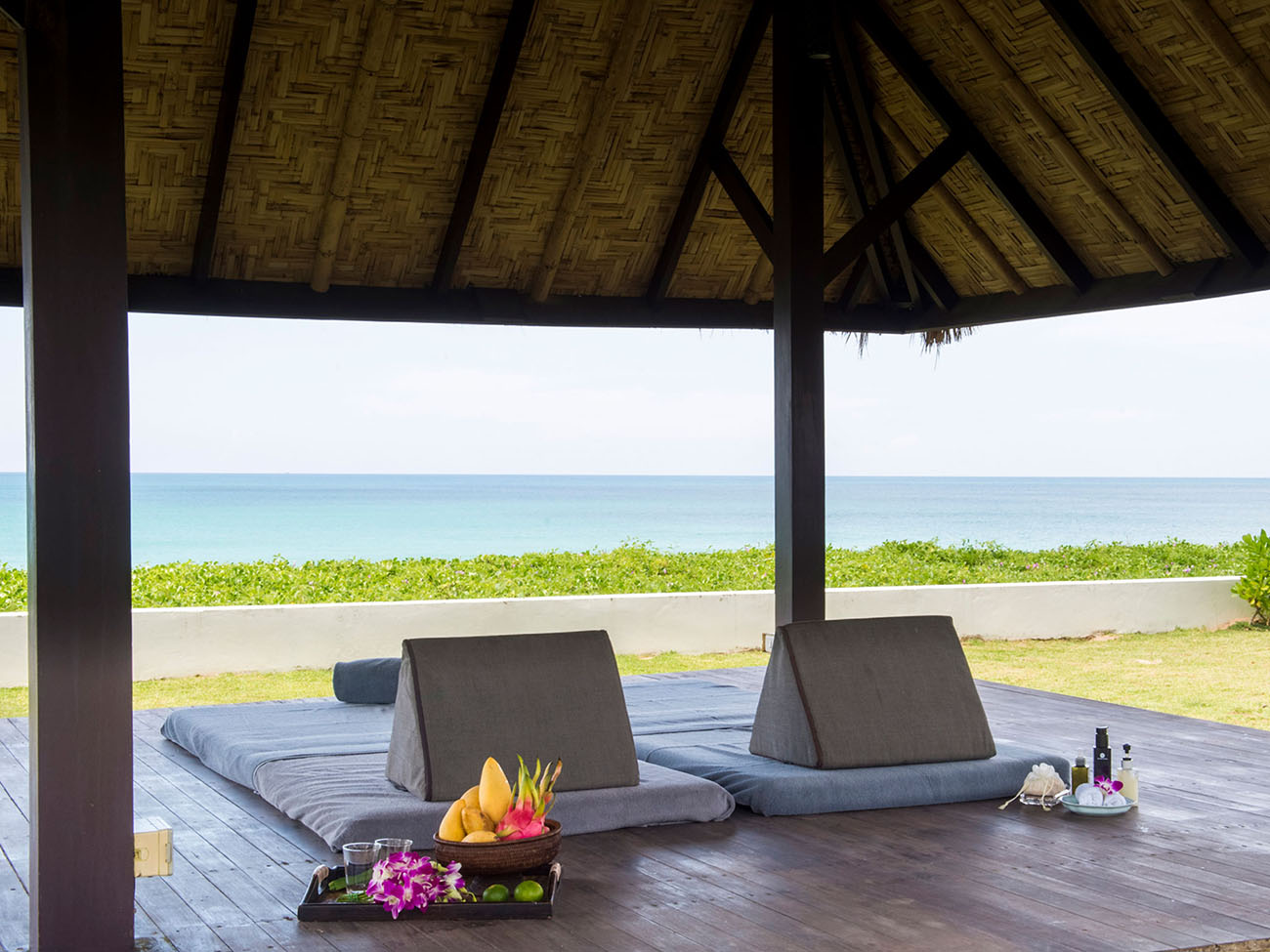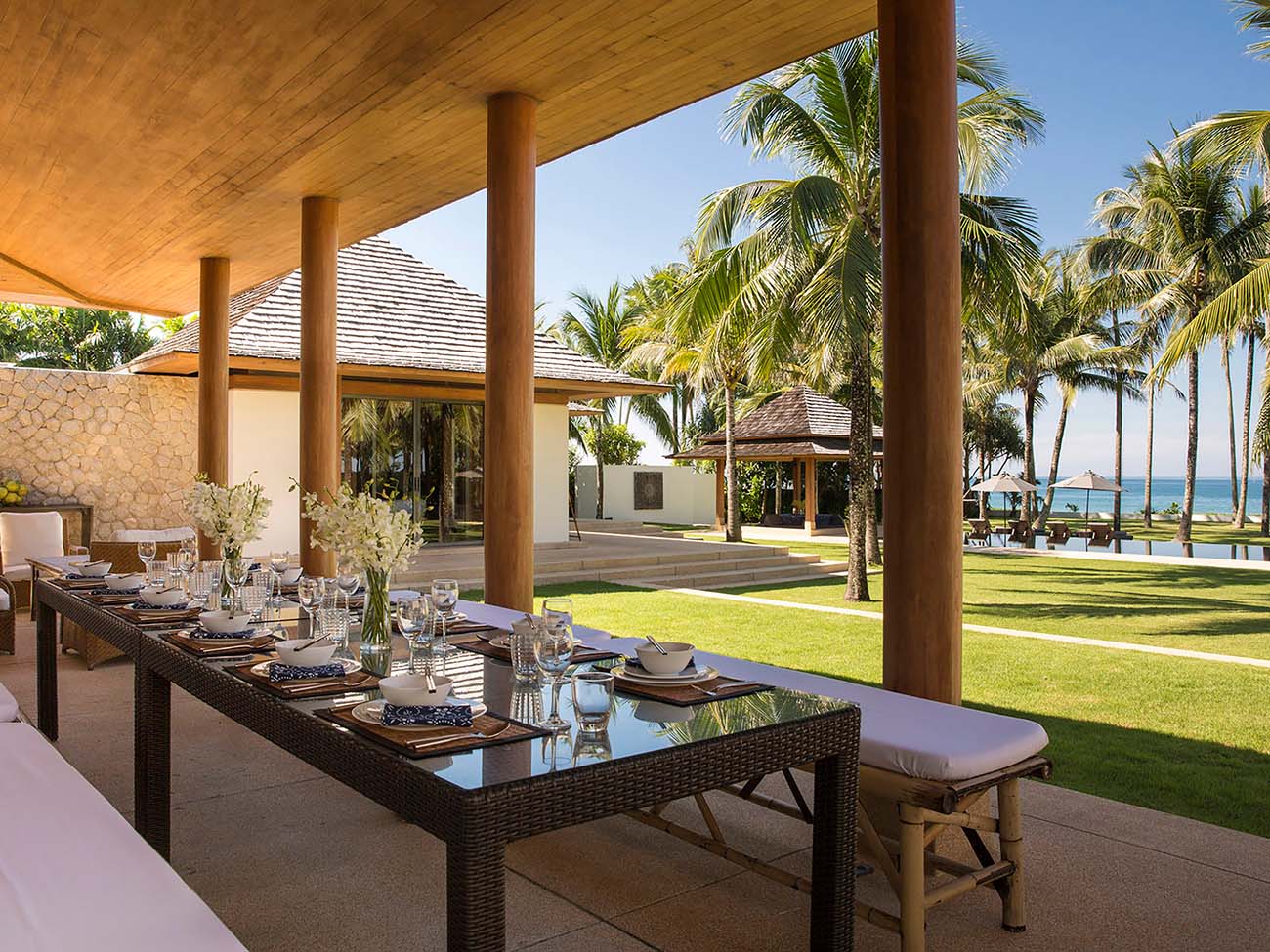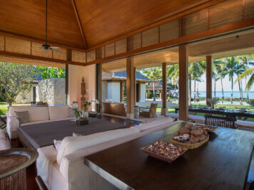 Spanning the bedroom pavilions, just outside the indoor living area, is a spacious open-air veranda where guests can lounge around or dine al fresco while enjoying the cool sea breeze.