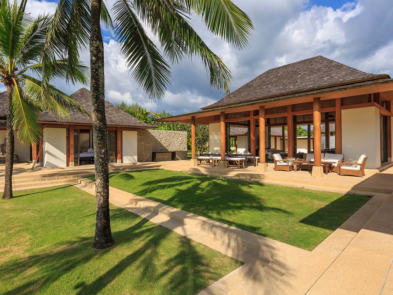 On each side of the Great Room are pavilions that house one master suite and two guest bedrooms each. Both master bedrooms and two guest bedrooms feature beautiful beachfront views and the lush greenery that surrounds while the other two guest bedrooms feature relaxing and serene garden views.