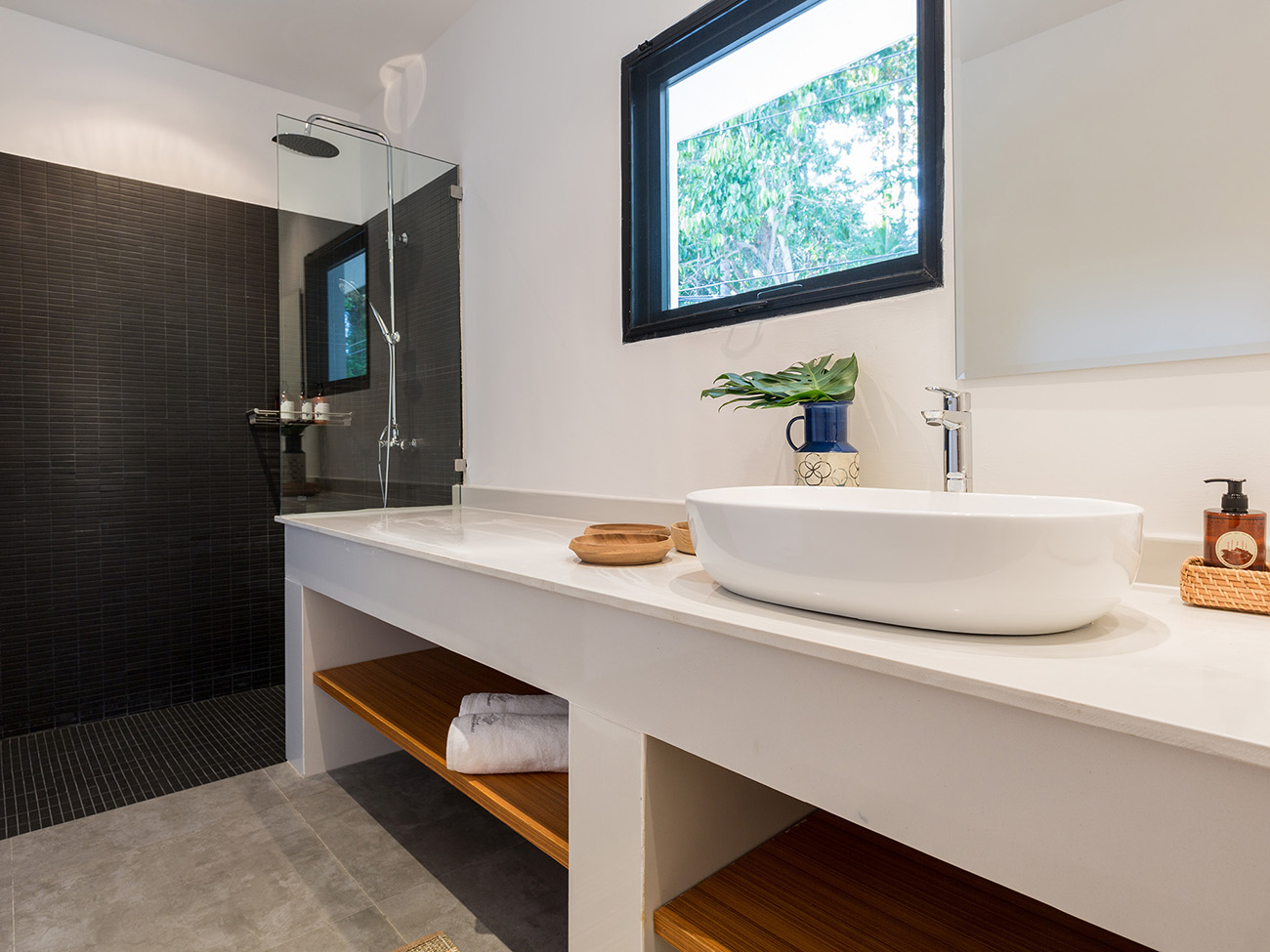 Bedrooms 3 & 4 – King size bed; Built-in desk; Adjoining seat and luggage shelf; Small private terrace; Two seater sofa and club-style chair; Ensuite bathrooms with light stone vanity and single sink; Walk-in rain shower and separate WC; Dressing area; Shelves; Safety deposit box; Air conditioning; Ceiling fan; Garden and pool view