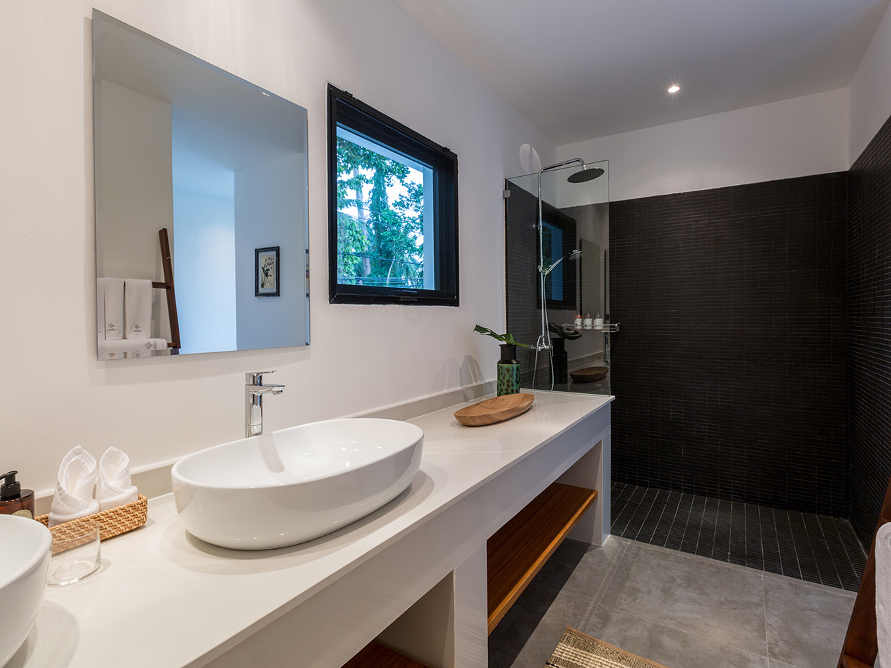 Bedrooms 1 & 2 – King size bed; Writing desk; Covered terrace; Sitting and dining area; Two seater sofa and easy chair and coffee table; Ensuite bathrooms with light stone vanity and double sinks; Walk-in rain shower and separate WC; Dressing area; Shelves; Safety deposit box; Air conditioning; Ceiling fan; Garden and sea view