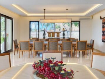 Guests can take advantage of the well-appointed dining area and kid’s playroom. From the outside, the expansive lawn, infinity pool, BBQ pit, and stone amphitheater of the villa turn it into a renowned event space. Easy access from the yard to nearby villas improves the scene for big parties.