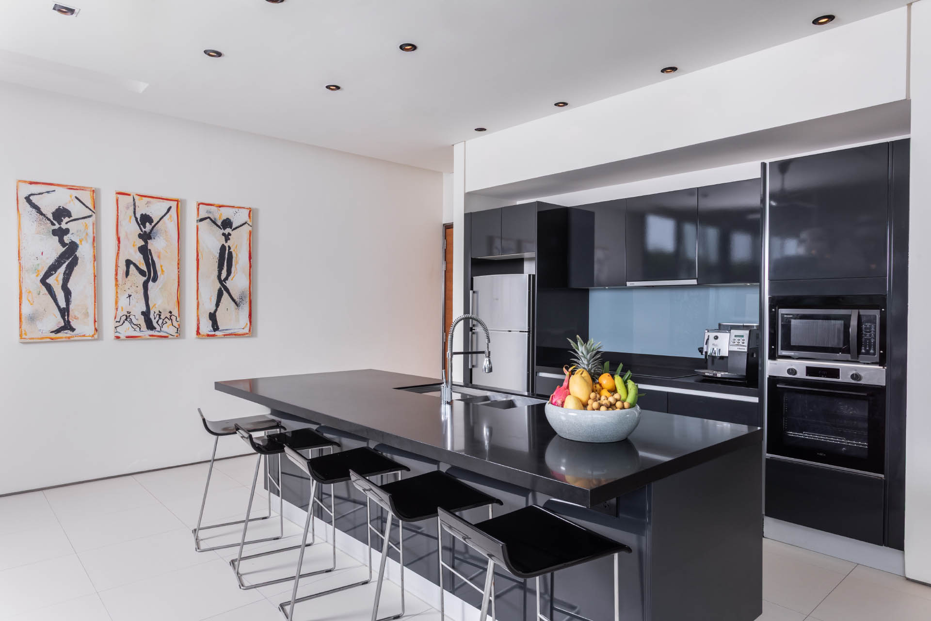 The villa’s grand open-plan living area, featuring plush seating and panoramic ocean views, forms the heart of social life at Tievoli. Adjacent lies a fully equipped Western-style kitchen and an elegant dining space enclosed by floor-to-ceiling glass, allowing natural light to flood the interiors while framing the spectacular coastal scenery.