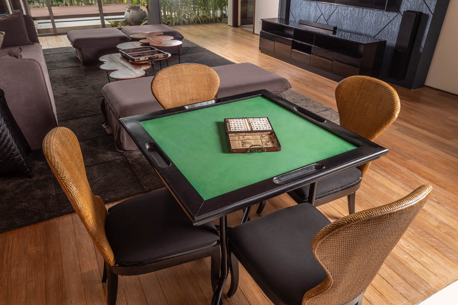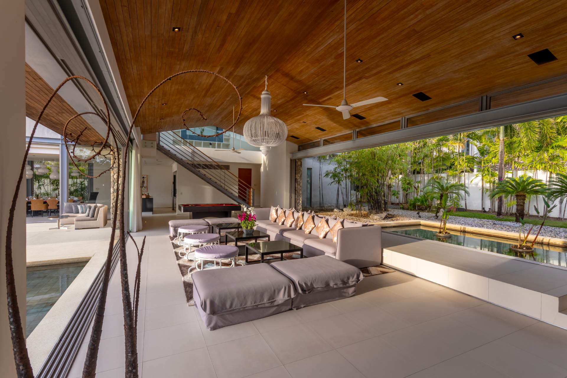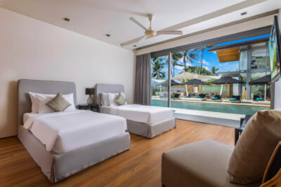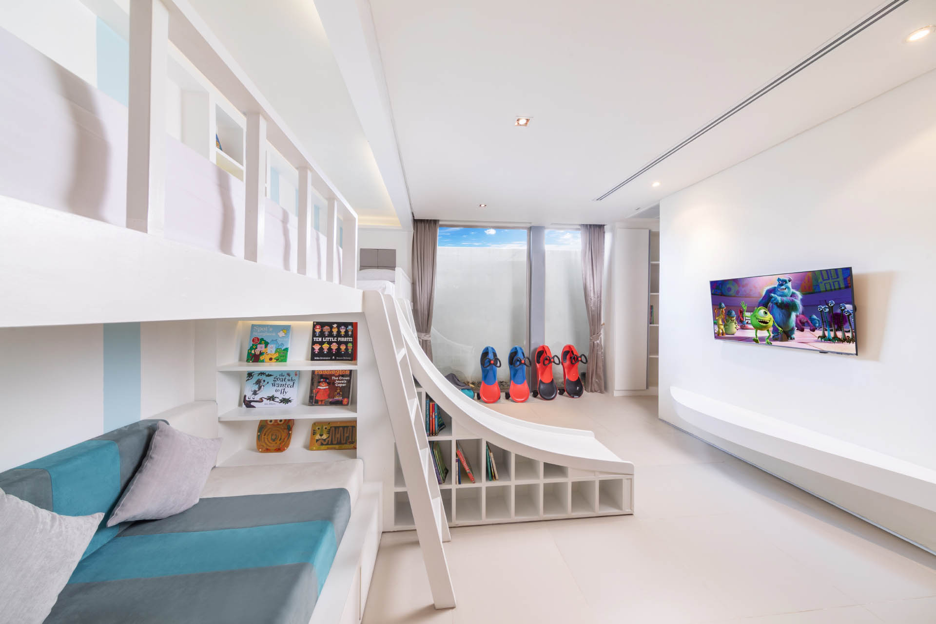 Accommodation includes two expansive master suites and five beautifully appointed guest bedrooms, each with an en-suite bathroom and thoughtful touches such as sound systems, flat-screen TVs, and comfortable lounging areas. The flexible room configurations—offering king, double, single, or bunk beds—ensure comfort for guests of all ages. Private balconies, walk-in closets, his-and-hers wardrobes, bathtubs, bathrobes, mini libraries, and children’s toys further enhance the villa’s versatility, blending family-friendly comfort with luxury living.