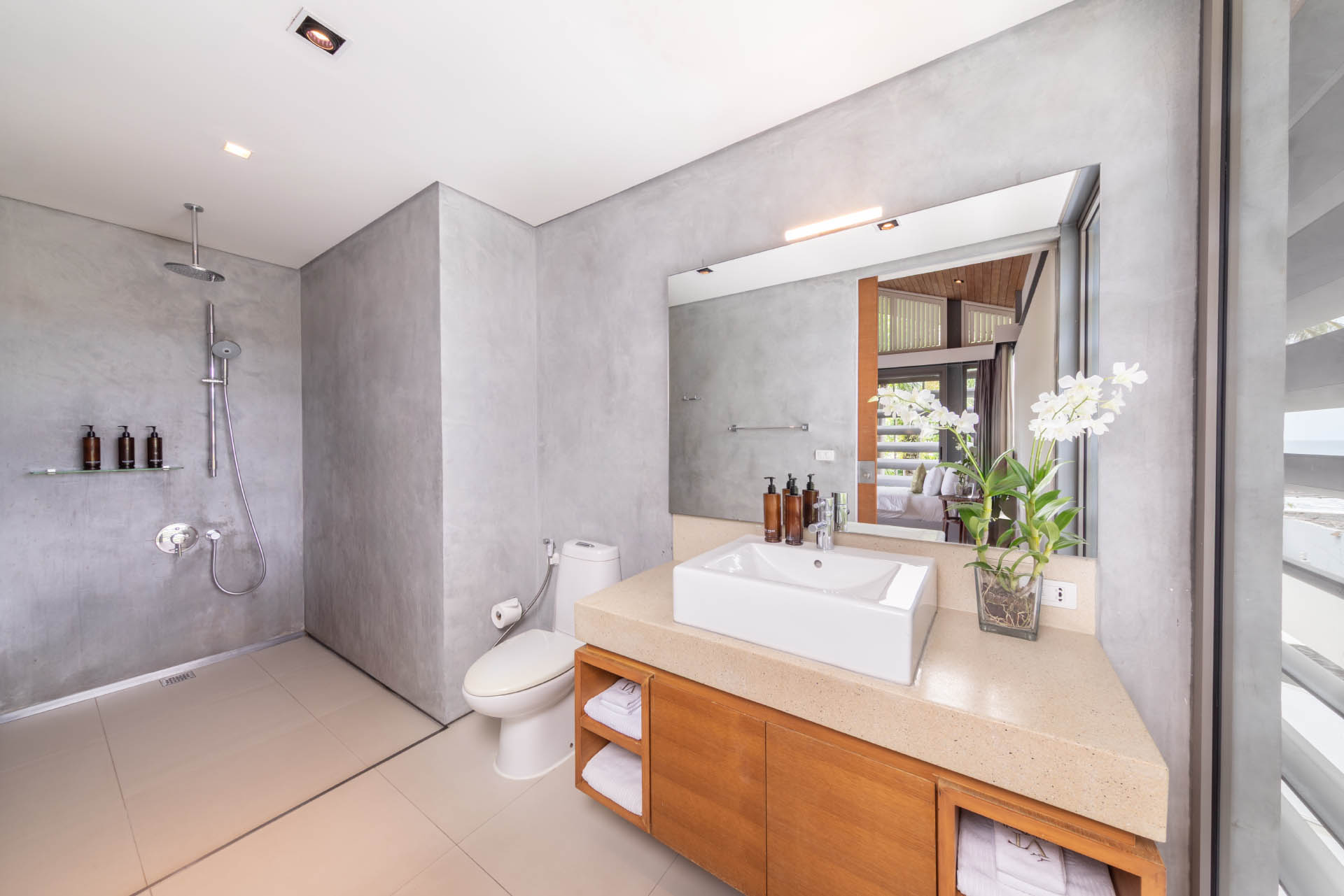 Master Bedroom 1 (68 m2) — King size bed; Ocean, swimming pool, and sunset views; Outside patio for 8 persons; Walk-in closet; Work desk; 42-inch flat screen TV with True Vision platinum package; Onkyo sound system; 3 seater couch; Safety box; Ceiling fan; Air conditioning; Ensuite bathroom with bathtub, rain shower, double vanities, and toilet; Toiletries; Hair dryer; Bathrobes; Slippers; Umbrellas