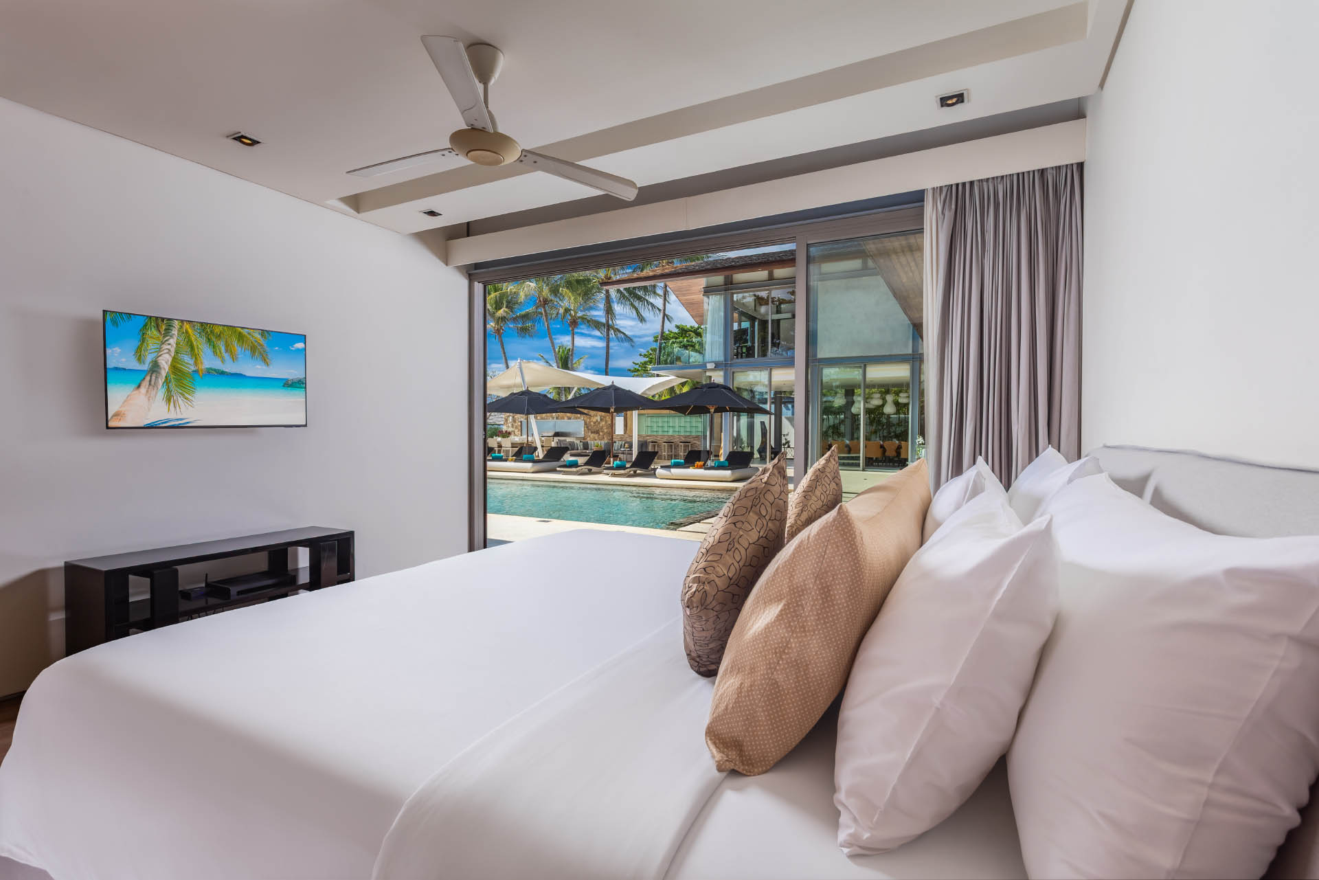 Master Bedroom 4 (50 m2) — King size bed; Ocean, swimming pool, and sunset views; Balcony with 2 seats; Walk-in closet; 42-inch flat screen TV with True Vision platinum package; Boston sound system; Ceiling fan; Air conditioning; Ensuite bathroom with rain shower, double vanities, and toilet; Toiletries; Hair dryer; Bathrobes; Slippers; Umbrellas