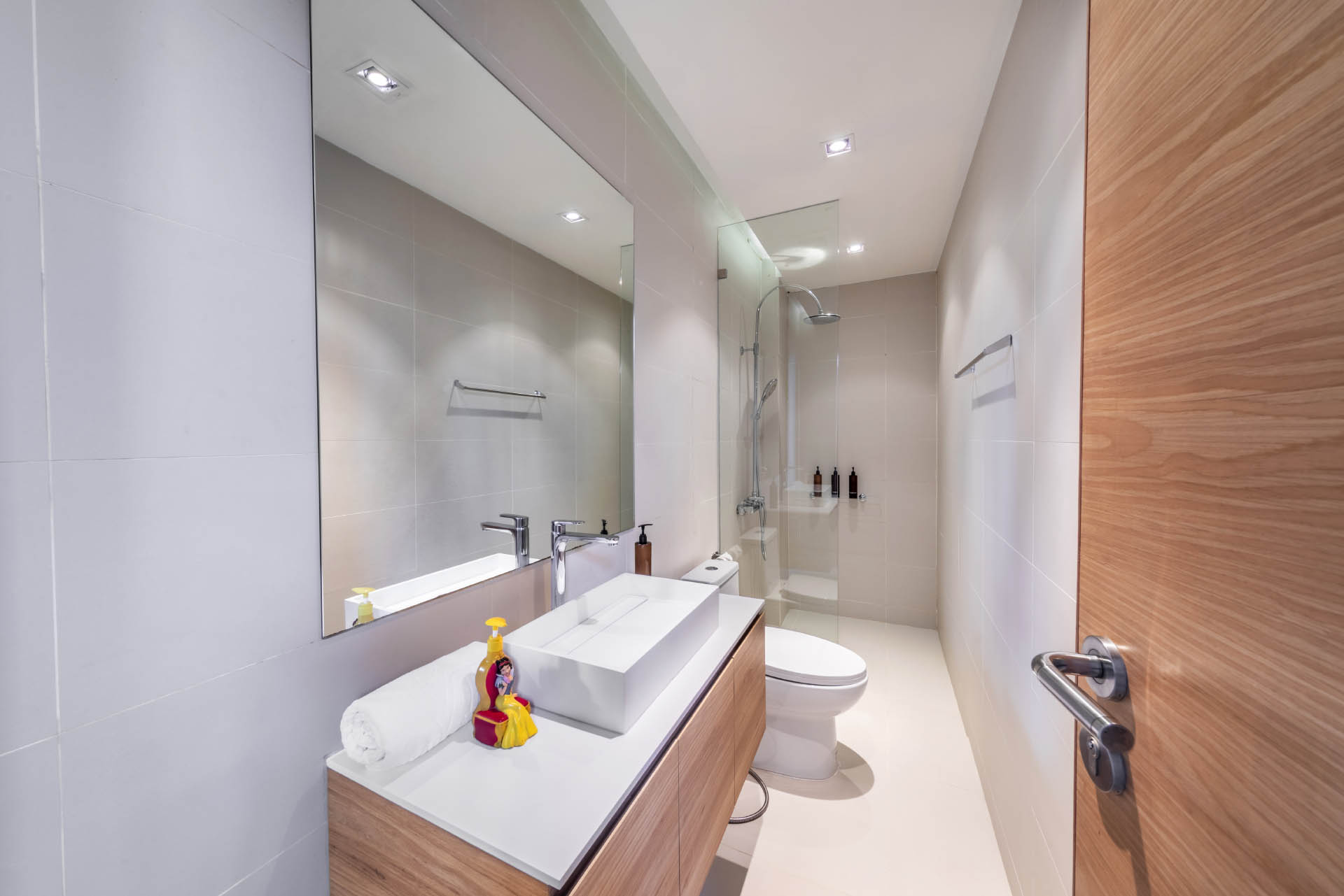 Guest Bedroom 2 (30 m2) — King size bed or 2 Single beds; Swimming pool view; Her & Him closet with a lock cupboard; 42-inch flat screen TV with True Vision platinum package; Ceiling fan; Air conditioning; Shared bathroom with bathtub, rain shower, double vanities, and toilet; Toiletries; Hair dryer; Bathrobes; Slippers; Umbrellas; Connecting to Bedroom 3